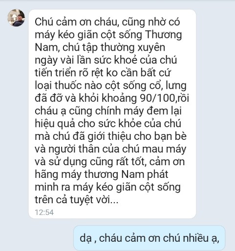 "Chú cảm ơn cháu, cũng nhờ có máy kéo giãn cột sống Thương Nam, chú tập thường xuyên ngày vài lần. Sức khỏe của chú tiến triển rõ rệt không cần bất cứ loại thuốc cột sống cổ, lưng đã đỡ và khỏi khoảng 90/100 rồi cháu ạ."
